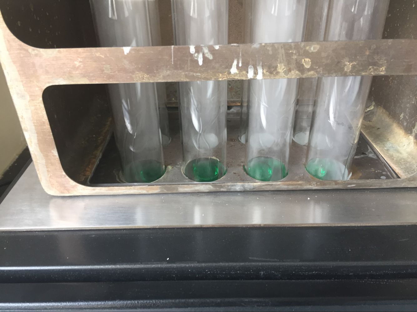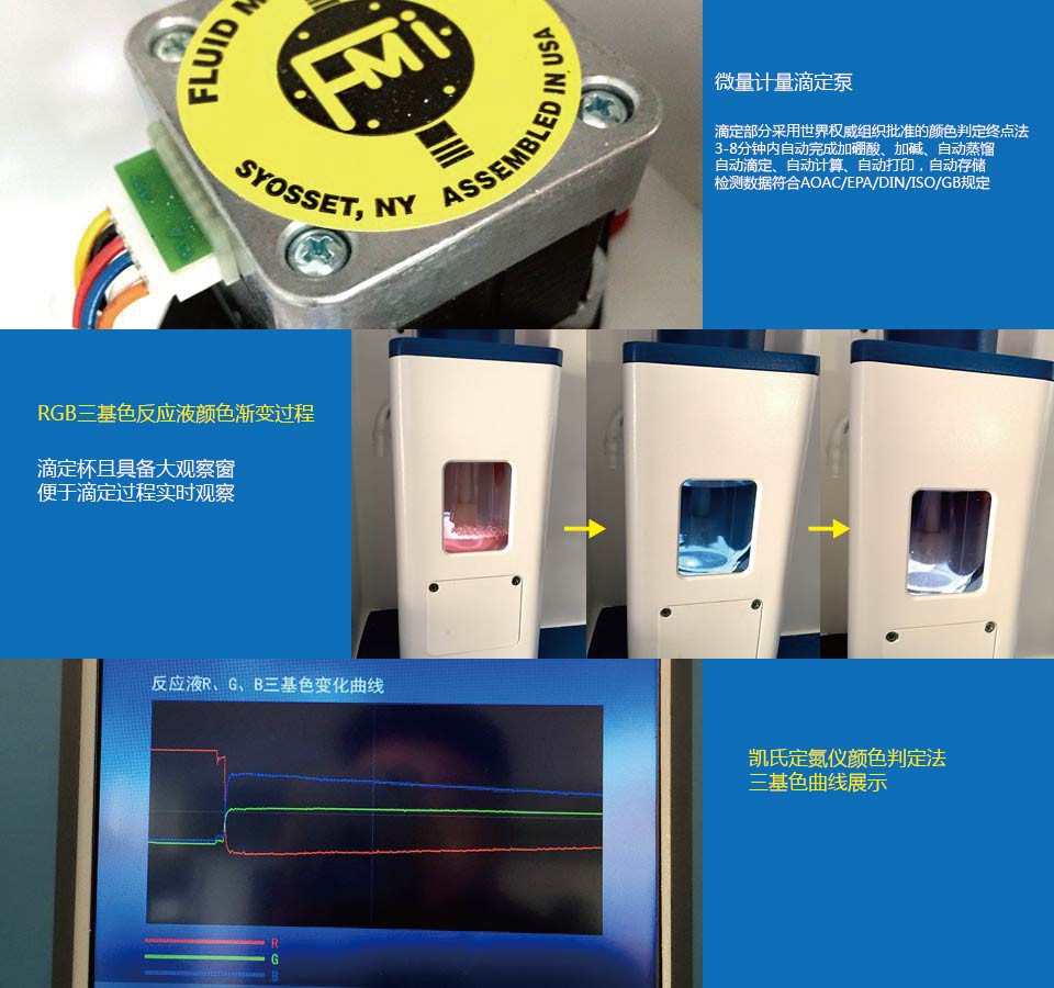 三、消解結束進入蒸餾滴定階段(NKY6120全自動凱氏定氮儀,采用的是邊蒸餾邊滴定同時進行的,終點顏色判定法)