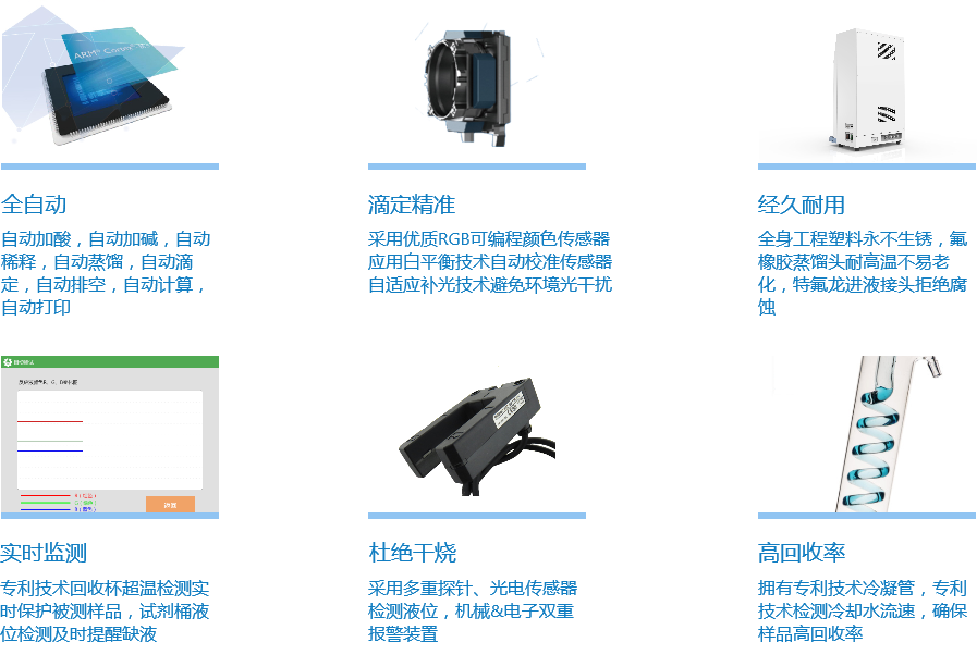 NKY6120凱氏定氮儀采用智能化程序設計,不但具有全程自動加酸、加減、稀釋和自動清洗功能,同時實現樣品在堿性條件下將銨鹽轉化為氨的自動蒸餾;而且在程序設定條件下通過高精度微量計量泵自動完成標準鹽酸滴定,通過RGB可編程光學傳感技術自動判定到達滴定終點,從而計算出樣品中氮的含量。該產品已成為食品企業、農林漁業、高等院校、科研機構、質量機構等部門的重要理化分析儀器
