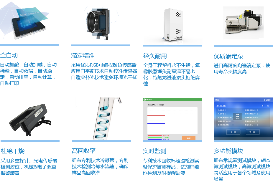 NKY6160凱氏定氮儀采用智能化程序設計,不但具有全程自動加酸、加減、稀釋和自動清洗功能,同時實現樣品在堿性條件下將銨鹽轉化為氨的自動蒸餾;而且在程序設定條件下通過高精度微量計量泵自動完成標準鹽酸滴定,通過RGB可編程光學傳感技術自動判定到達滴定終點,從而計算出樣品中氮的含量。該產品已成為食品企業、農林漁業、高等院校、科研機構、質量機構等部門的重要理化分析儀器